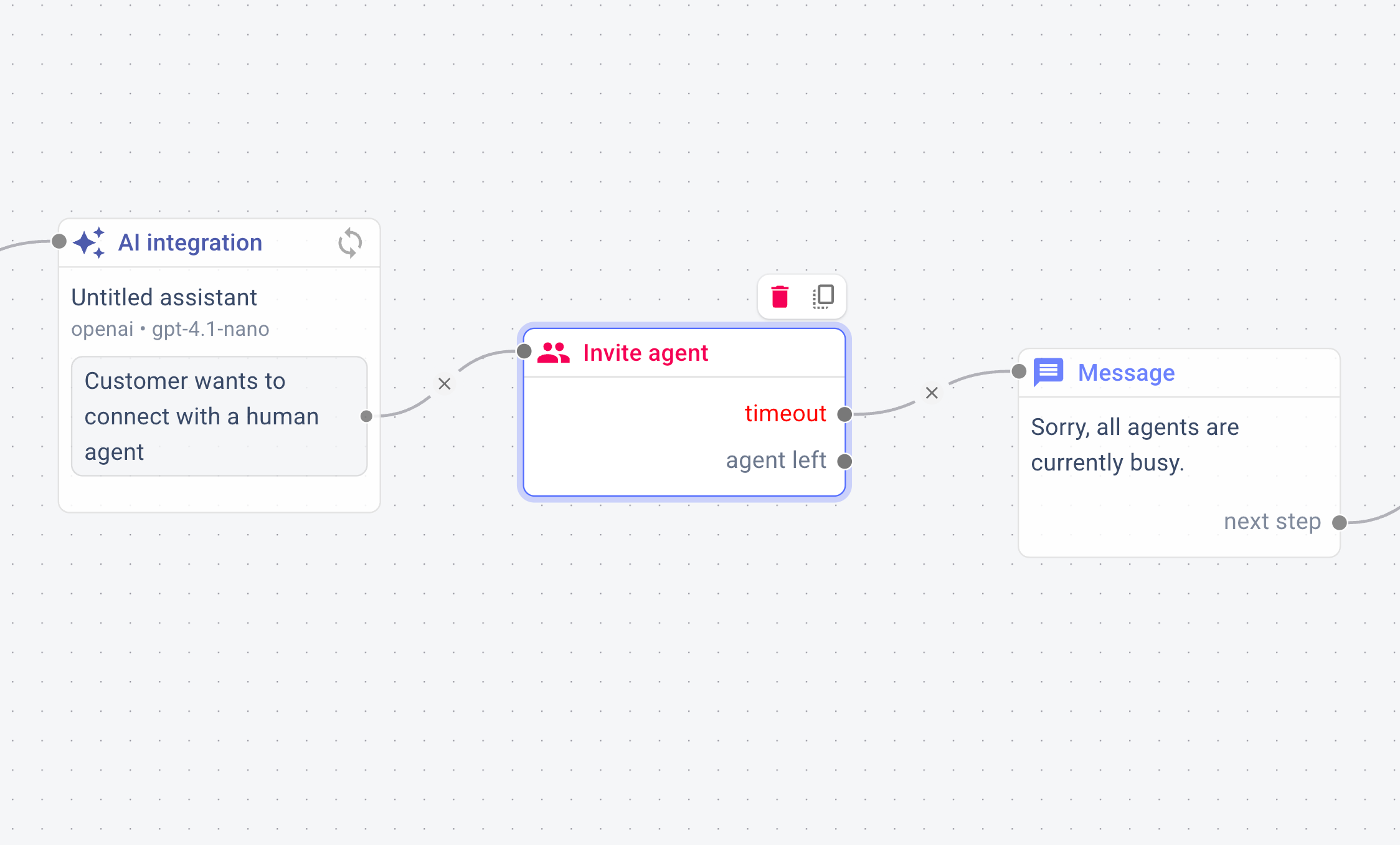 Design bot journeys that answer repetitive questions and hand off to agents when needed.