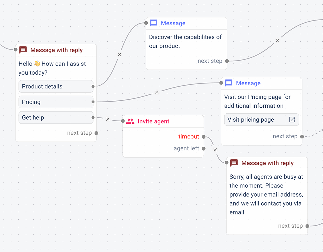 Ensure your customers always get the help they need. Automatically hand off conversations from your chatbot to a live agent when complex issues arise, keeping support efficient and personal.