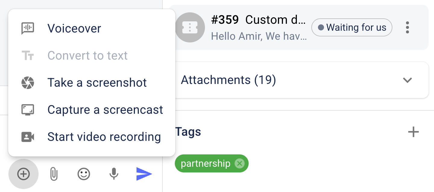 Go beyond plain text messages by using voice, screenshots, and video to explain solutions faster and make conversations more helpful and engaging.