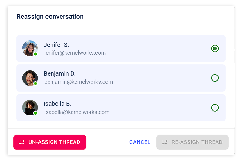 Work together with your team in a shared inbox where conversations can be organized, assigned, and managed efficiently.